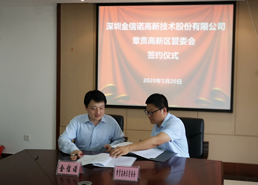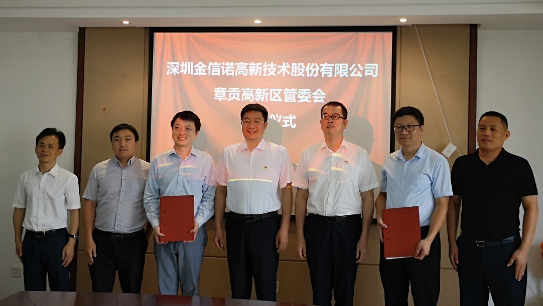 金信诺集团总经理余昕、章贡高新区副主任韩江华代表双方签约。赣州市委常委、章贡区委书记高世文,章贡区委常委、统战部部长郑成功见证双方签约,章贡工信局局长刘炜金信诺集团采购中心副总经理姚新征、项目申报总监殷宇剑出席签约仪式。