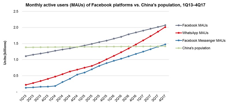 图1:到2017年底Facebook旗下三个产品每一个都将拥有比中国人口还要更大的规模